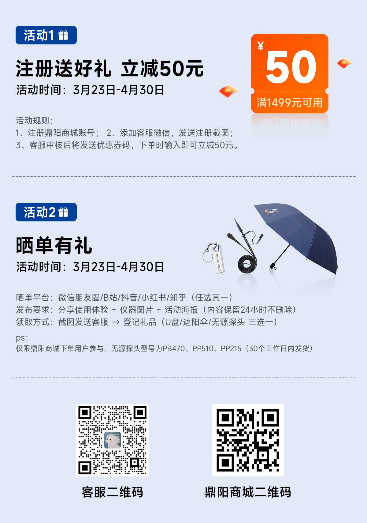 • 活动礼品:U盘 / 遮阳伞 / 无源探头(三选一)