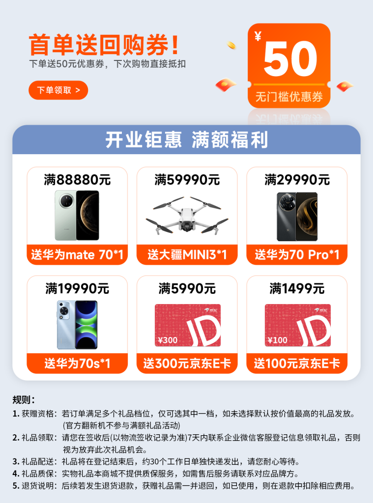 - 购满额送华为Mate 70、大疆无人机、小米电饭煲等多种好礼!(官方再生机不参与满额礼品活动)