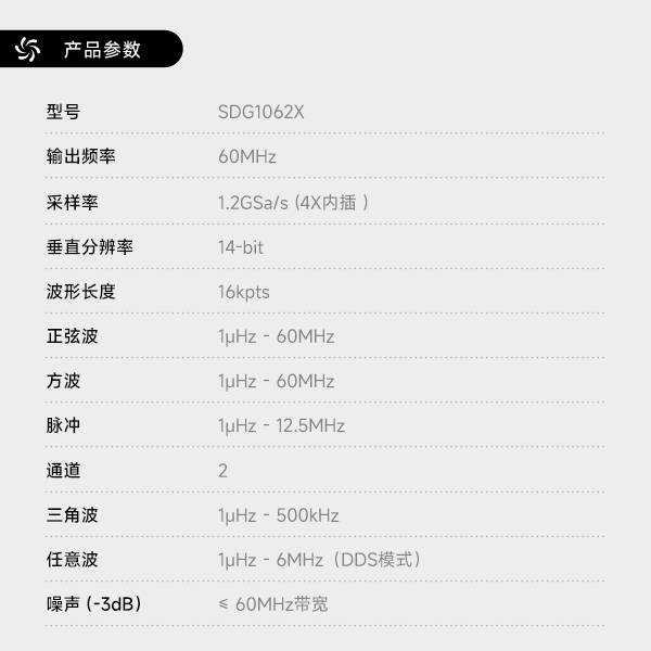 等性能双通道。正弦波、方波最大输出频率60MHz